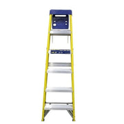 Escalera Surtek ETFV25 de fibra de vidrio dieléctrica te da seguridad y alcance en tareas de altura con 5 peldaños, peldaños antiderrapantes y tapa ProTop para organizar herramientas.