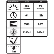 - Alto: 180 lúmenes · 2,180 candelas · 93 m · 6 h