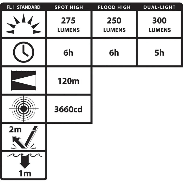 • Alto: 275 lm, 120 m, 6 h
